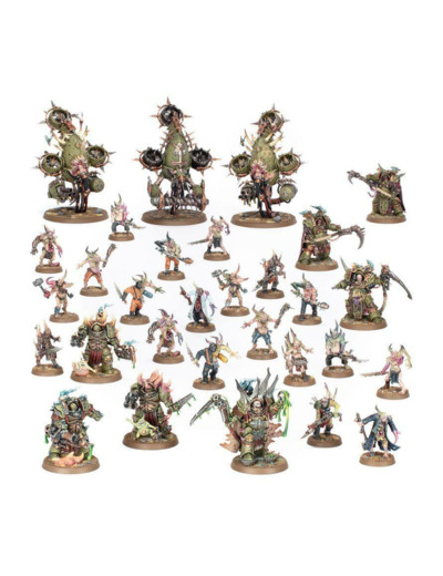 Cette boîte pleine à craquer est parfaite pour entamer une nouvelle collection de la Death Guard ou pour étoffer une armée existante que vous pourrez ensuite déchaîner dans les parties de Warhammer 40,000, en faisant des économies par rapport à un achat des kits au détail. Mené par le Seigneur Felthius, un Seigneur de la Contagion, et sa garde de Terminators Rouillarques, le gros de cette force est composé de Véroleux qui inondent le champ de bataille, prennent le contrôle des objectifs cruciaux et absorbent la puissance de feu de l'ennemi. Un trio de Terminators du Linceul se tiennent prêts à abattre les cibles les plus robustes, et trois Drones Fétides soutiennent la force avec leur vitesse accrue.