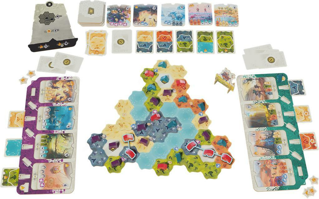 Chaque tour, vous devrez choisir entre piocher de précieuses cartes Terrain ou avancer sur la carte. Le moindre mouvement compte : vos camps bloquent, connectent ou ouvrent de nouvelles voies vers la victoire. Grâce à un système de placement malin, des objectifs à valider (tuiles Histoire) pour marquer plus de points et des effets de terrain variés, chaque décision tactique impacte votre score final. En plus de la conquête de territoires, vous devrez maîtriser le feu, récolter des baies et connecter vos camps pour maximiser votre score. Tout en mettant des batons dans les roues de vos adversaires !