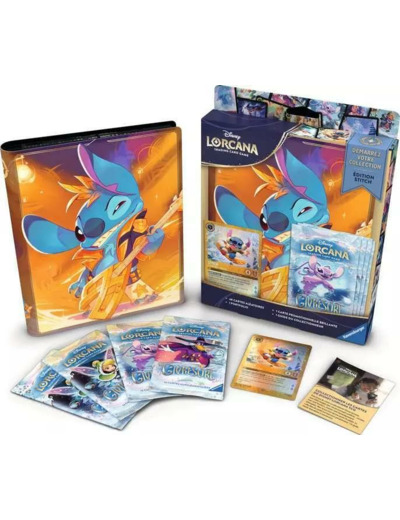 Lorcana - Coffret Démarrez Votre Collection - Givresort est un coffret de démarrage pour Lorcana comprenant 4 boosters du set Givresort, un guide du collectionneur, un portfolio A5 pour ranger vos cartes et une carte promo brillante Stitch.