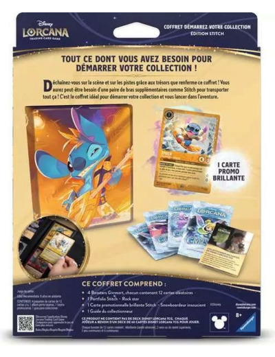 Contenu du coffret : 1 portfolio A5 pour ranger vos cartes, 4 boosters Lorcana Givresort de 12 cartes chacun, 1 carte promo Stitch avec finition brillante spéciale, 1 guide du collectionneur.