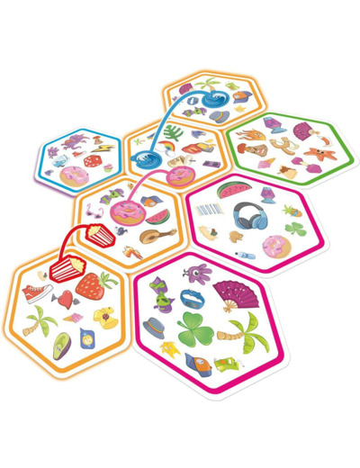 Le but est de repérer le seul symbole commun entre deux cartes et d’aligner quatre cartes hexagonales de votre couleur en équipe.