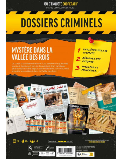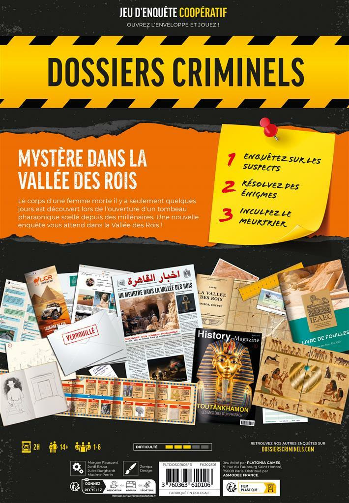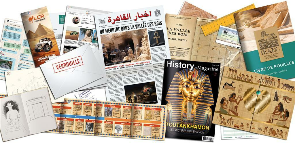 Ce dossier criminel contient tous les éléments pour résoudre ce meurtre. Un guide des fouilles, des transparents de la vallée des rois, des papyrus, un article de presse, des croquis, des contenus audio... etc.