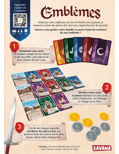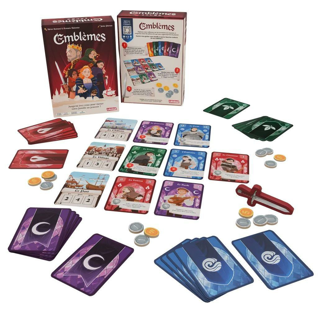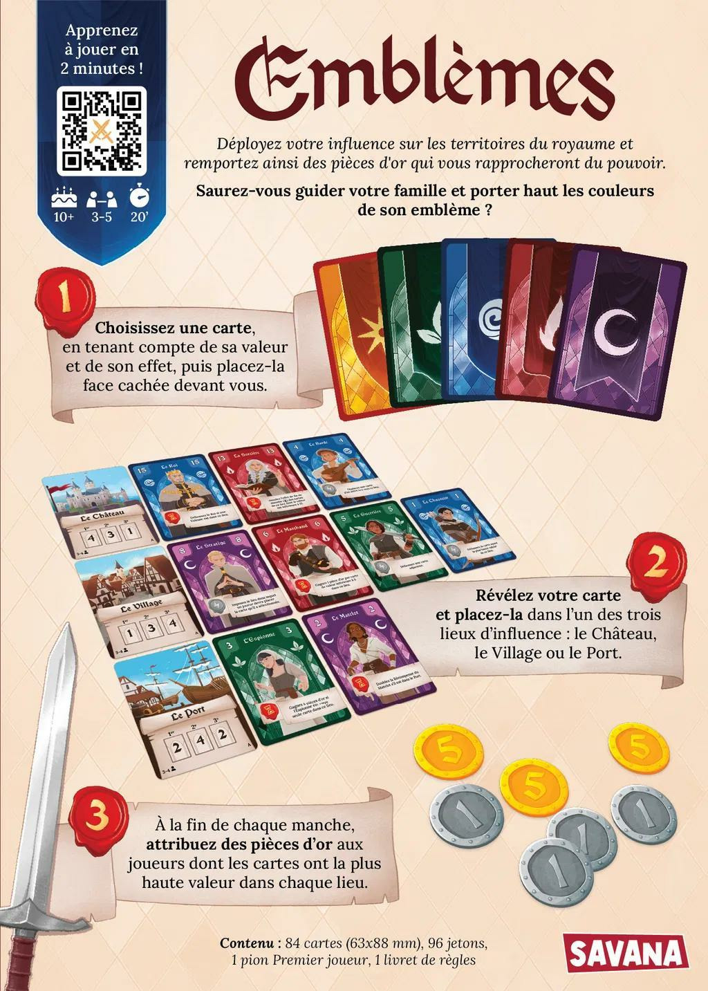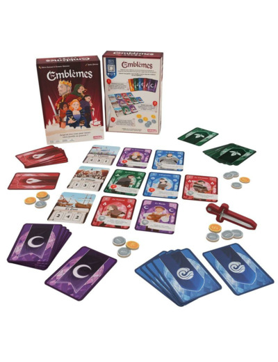 EMBLÈMES est un jeu de cartes qui mêle réflexion stratégique, placements opportunistes et man◊uvres sournoises ! Au début de chaque tour, choisissez une carte, en tenant compte de sa valeur et de son effet, puis placez-la, face cachée, devant vous. Puis, l'un après l'autre, révélez votre carte et placez-la dans l’un des trois lieux d’influence : le Château, le Village ou le Port. À la fin de chaque manche, attribuez des pièces d’or aux joueurs dont les cartes ont la plus haute valeur dans chaque lieu. À la fois simple, surprenant et un brin chaotique, EMBLÈMES récompense souvent les joueurs les plus malins (ou les plus audacieux) !