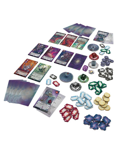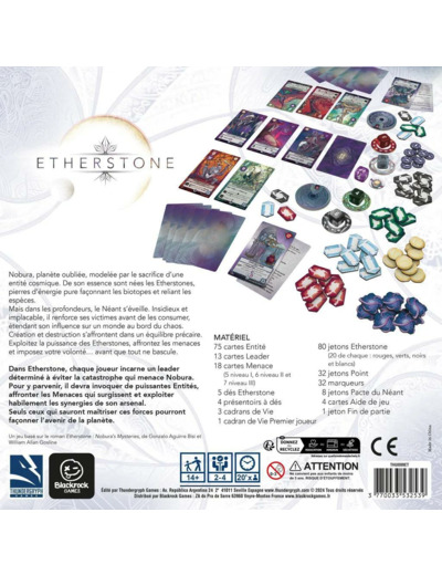 Etherstone est un jeu de combos de cartes et de gestion de ressources dans lequel vous tentez de remporter un maximum de points de victoire. La première étape du jeu consiste à drafter votre main de 7 cartes et votre carte leader. En sélectionnant les dés vous pourrez créer les pierres d'Ether qui sont au c◊ur du jeu, permettant d'invoquer des cartes de votre main, d'activer des pouvoirs spéciaux et de neutraliser des menaces.