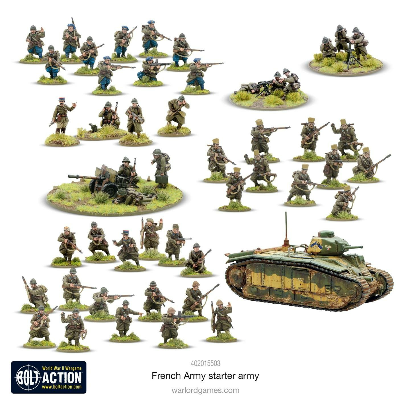 Le set comprend 36 figurines d’infanterie en plastique multi-poses, un Char B1 bis moyen en plastique, une équipe HQ en métal, une équipe de mortier moyen en métal, une équipe MMG en métal, un canon anti-char 25mm en métal, des socles en plastique, une carte de statistiques Bolt Action, des marqueurs de dégâts pour véhicules et une planche complète de décalcomanies couleur.