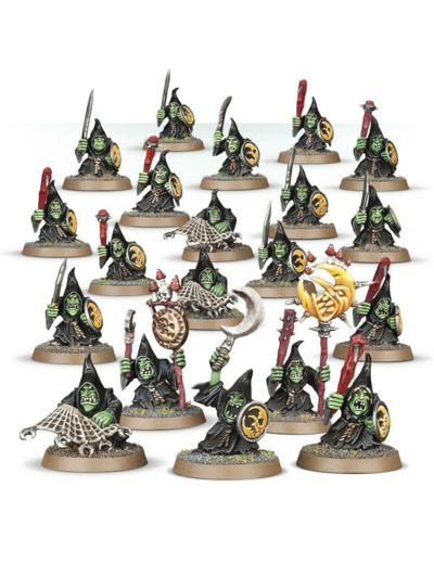 Vous trouverez dans ce kit suffisamment de kitrou', de lances pointu’, et de boucliers d’la lune pour monter une unité de Stabbas, et alternativement vous avez assez d'arcs Moonclan et de kitranch' pour monter une unité de Shootas. Vous avez aussi de quoi assembler des porte-étendards, un sonneur de gong, 2 rétiaires et un kitrou' spécial pour désigner le Moonclan Boss de l'unité.