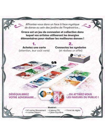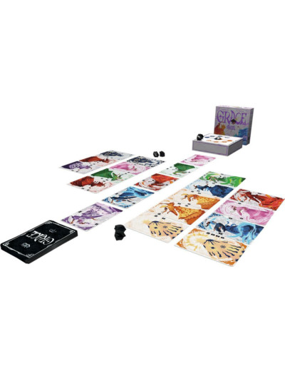 Dans Grace, incarnez un artiste des clans du Soleil ou de la Lune et affrontez-vous dans les jardins de l’Impératrice. Chaque tour, achetez et jouez des cartes en dépensant du Ch’i, enchaînez les symboles pour déclencher des effets stratégiques et manipuler le tempo du duel. Le pion Équilibre reflète votre domination : poussez-le jusqu’au bord pour faire chuter l’adversaire ou terminez des danses harmonieuses pour séduire le public et déclencher une explosion finale de points. Les illustrations envoûtantes et la fluidité du gameplay rendent chaque partie intense et poétique.