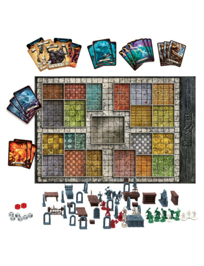 Inclut plateau de jeu, 31 figurines de monstre, 4 figurines de héros, 15 pièces de mobilier, 10 crânes, 4 rats en plastique, 21 portes de donjon, 93 cartes de jeu, 4 cartes de référence, tuiles cartonnées, livre des quêtes, 4 cartes de personnage, écran du maître de jeu, bloc de feuilles de personnage, 6 dés de combat blancs, 2 dés rouges et livre des règles.
