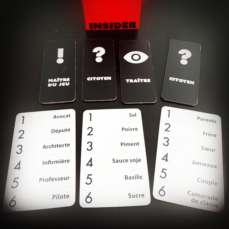 Un jeu simplissime : des cartes rôles sont distribuées aléatoirement pour 4 à 8 joueurs, désignant un maitre du jeu, un Insider (traitre), tous les autres joueurs sont d'honnêtes citoyens.