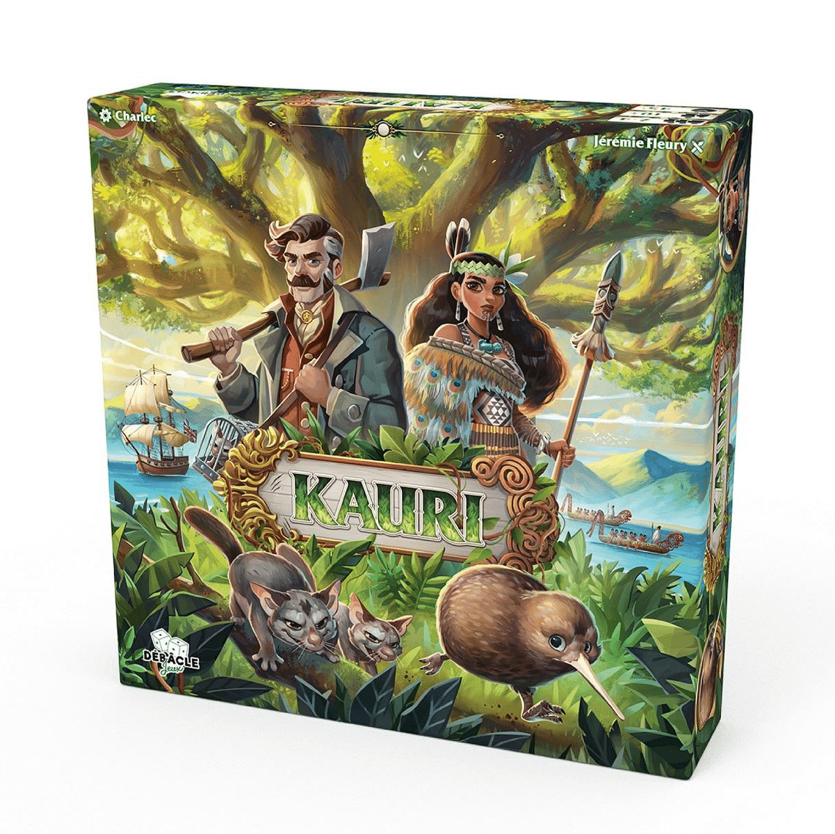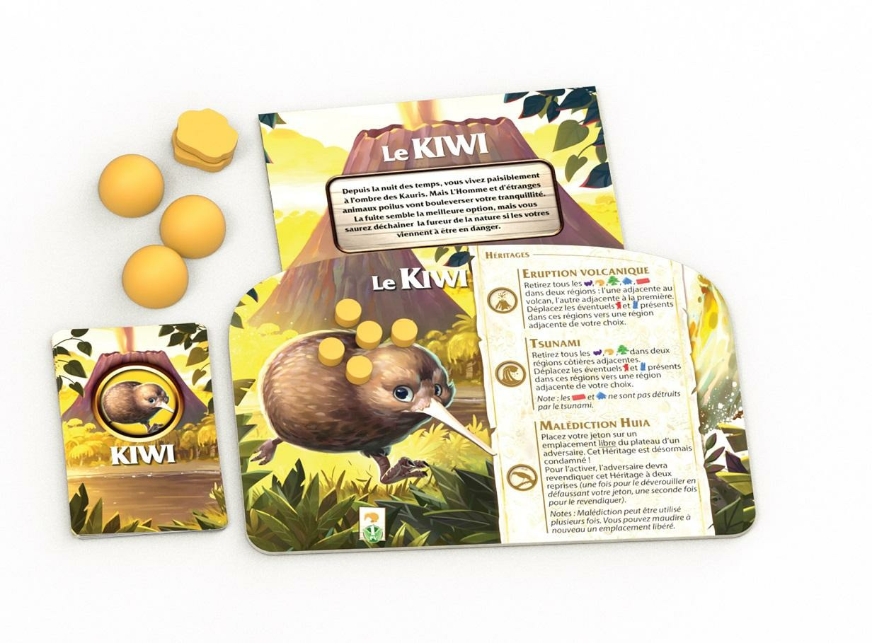 Le coffret comprend un plateau de jeu, 4 plateaux individuels, 4 jeux de 9 cartes, 17 jetons Heritage, 2 jetons Compteur, 30 pièces Kauri, 28 Kiwis, 1 Maorie, 2 Anglais, 30 Possums, ainsi que des jetons en bois spécifiques à chaque faction et les règles complètes. Auteur : Charlec. Illustrateur : Jérémie Fleury. Éditeur : Débâcle Jeux.