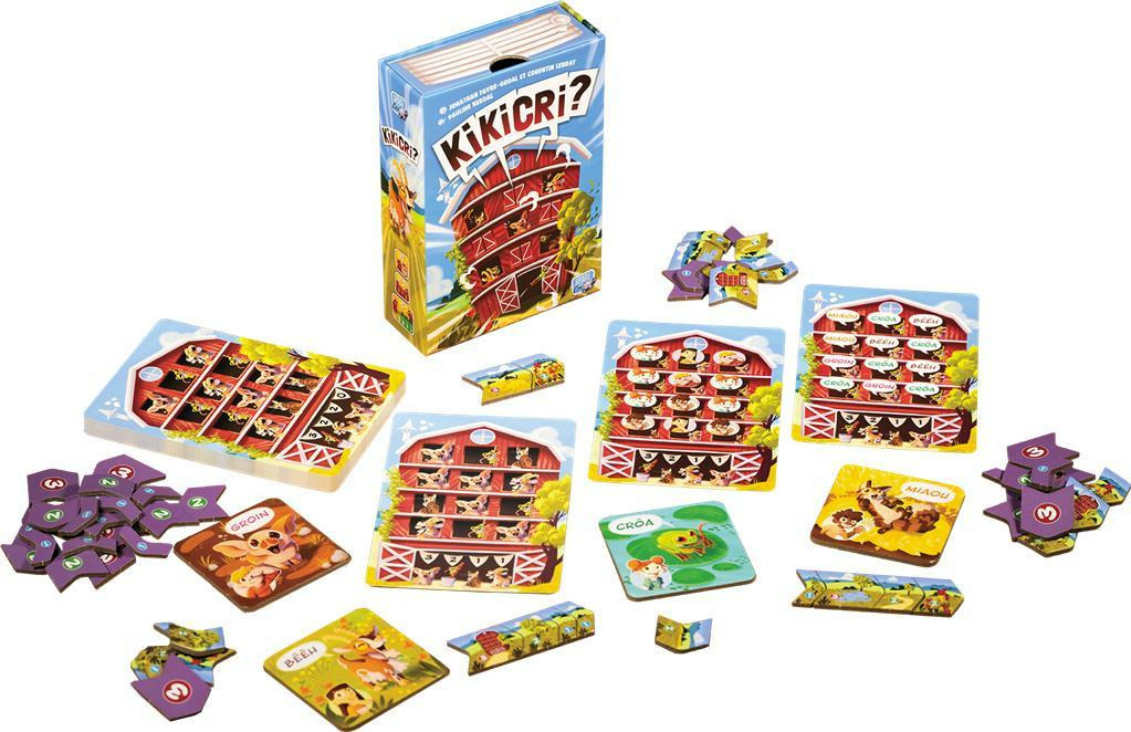 La cour de la ferme est agitée ! Chacun leur tour, les joueurs miment ou imitent les animaux. Les autres doivent interpreter ces signaux et repérer l’animal le plus représenté.. ou celui qui manque à l'appel. Dans une mini-boîte ingénieuse qui se transforme en grange, tentez de former le plus grand paysage en marquant un maximum de points ! Kikicri ? est un jeu d'ambiance qui demande de l'attention, de la rapidité et un peu de mémoire, aux enfants dès 5 ans. Les règles simples et accessibles permettent des parties courtes, réunissant jusqu'à 6 joueurs. Fous rires au rendez-vous.