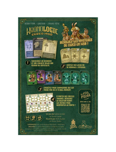 Après le succès de Kronologic – Paris 1920; résolvez les enquêtes à Cuzco, en 1450. Enquêtrices, enquêteurs, c’est à vous de démêler une série de mystères inexpliquées qui ont toutes eu lieu à Cuzco, au Pérou. Chacune des enquêtes, à la complexité variable, mettra à l’épreuve votre perspicacité et vos compétences de déduction logique. Qui ? Où ? Quand ? Votre objectif est de résoudre chaque mystère avant les autres, et de rétablir la vérité.
