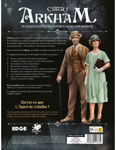 Dans ce guide touristique très spécial de cette ville légendaire du comté d’Essex, vous découvrirez ses habitants, ses commerces, ses associations et ses institutions, mais aussi ses plus sombres aspects. Toutes sortes de gens vivent à Arkham, chacun ayant son lot de joies et de peines, ses aspirations... et ses secrets. Conc◊u comme un décor pour des scénarios ou pour une campagne de type « bac à sable » , ce livre contient tout ce qu’il faut pour inventer et jouer de formidables aventures de L’Appel de Cthulhu à Arkham. Il décrit près de 300 lieux uniques et plus de 80 personnages non joueurs (PNJ), prêts à rencontrer les investigateurs de votre groupe.