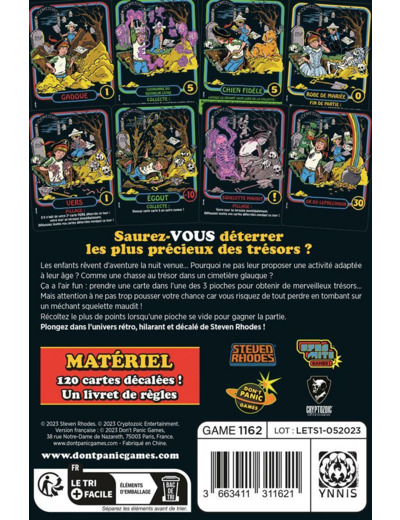 Vous pouvez arrêter de creuser à tout moment, ou continuer à creuser des cartes aussi longtemps que vous le souhaitez... plus vous déterrez de cartes avant de « vous arrêter » , plus vous avez à gagner - mais soyez prudent - si vous creusez une 2ème carte Vers, ou même une seule carte squelette, votre tour se termine immédiatement et vous perdrez tout que vous avez déterré jusqu'à présent (ce tour) !