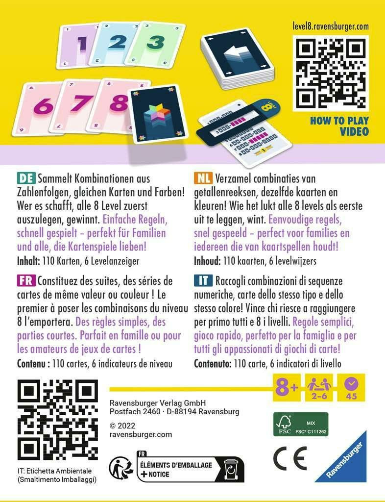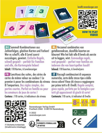 Des combinaisons de plus en plus difficiles, un suspense croissant ! Qui atteindra le sommet des 8 niveaux en premier ? Soyez le plus rapide à réunir les combinaisons de cartes demandées pour monter de niveau : suites de cartes croissantes ou décroissantes, cartes de même valeur ou de même couleur. Devenez le premier à vous débarrasser de toutes vos cartes pour gagner des niveaux supplémentaires et vous rapprocher plus rapidement de la victoire. Mais attention, plus votre niveau augmente, plus les combinaisons de cartes deviennent difficiles, rendant ce jeu de société d’autant plus amusant !Qui viendra à bout des 8 niveaux le premier et l'emportera ? Plongez dans l'univers de Level 8, le jeu de cartes qui réinvente le plaisir du jeu en famille et entre amis. Alliant stratégie et suspense, chaque partie est une nouvelle aventure où votre concentration et votre sens de l'observation seront mises à l'épreuve. Accessible à tous grâce à ses règles simples, ce jeu aux défis progressifs garantit des moments intenses et mémorables. Êtes-vous prêts à relever le défi et à atteindre le sommet ? Rejoignez la communauté Level 8 et vivez l'expérience ludique ultime.