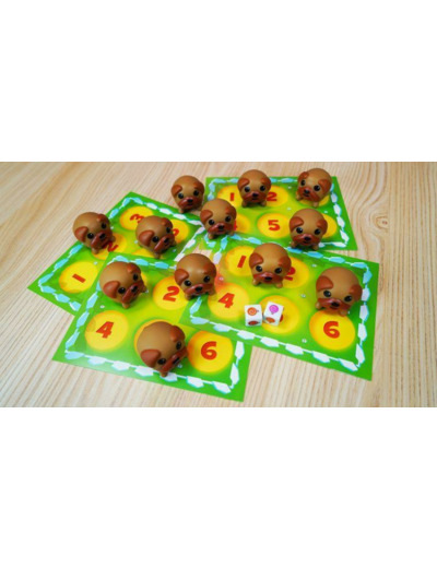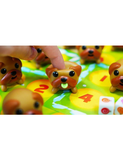 Toutes les sucettes ont été mangées et les gourmands petits toutous sont fortement soupçonnés d'avoir fait le coup! A toi de mener l'enquête! Quand tu appuies sur leur ventre, ils sortent leur langue! A chaque tour, lance les dés colorés et essaye de retrouver les toutous dont la couleur de la langue correspond! Le premier joueur à avoir attrapé 6 toutous gourmands remporte la partie!