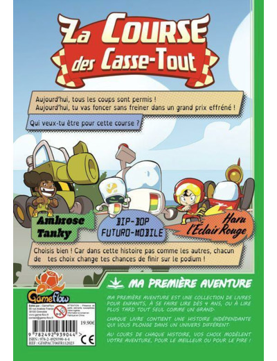 Maintenant, ton aventure peut commencer. Tu vas pouvoir lire ce livre normalement, de gauche à droite, mais rapidement, tu feras face à des choix matérialisés par des pages coupées en trois. Tourne la partie de ton choix et découvre ce qui va se passer. Après plusieurs choix, tu arriveras à la fin de la course... Seras-tu le nouveau champion de la course des Casse-tout ?