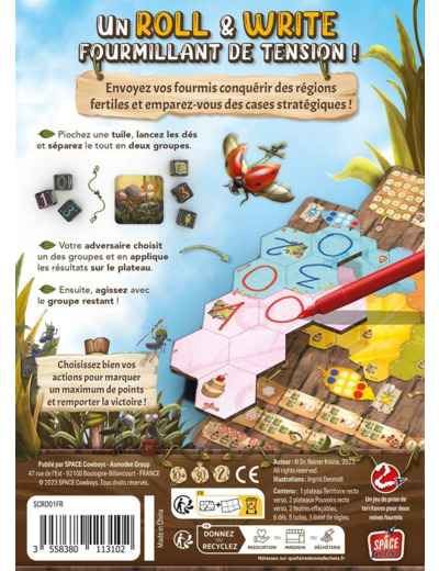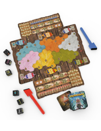 C’est la guerre dans la prairie ! Deux fourmilières se disputent le contrôle des lieux. Marabunta est un ‘roll and write’ (lancer les dés et écrivez les résultats) conçu spécifiquement pour deux joueurs par le célèbre et talentueux Reiner Knizia.