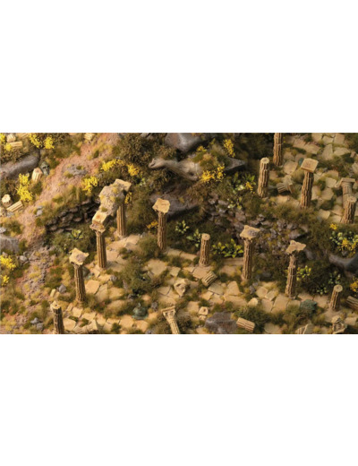 Conçue pour recréer l’atmosphère unique des ruines corinthiennes et doriques envahies par une végétation méditerranéenne, cette boîte combine des éléments soigneusement sélectionnés : colonnes anciennes, touffes d’herbe variées et plantes découpées au laser. Le livret tutoriel et la vidéo guide vous accompagnent pas à pas, du montage à la peinture, pour un décor spectaculaire accessible à tous.
