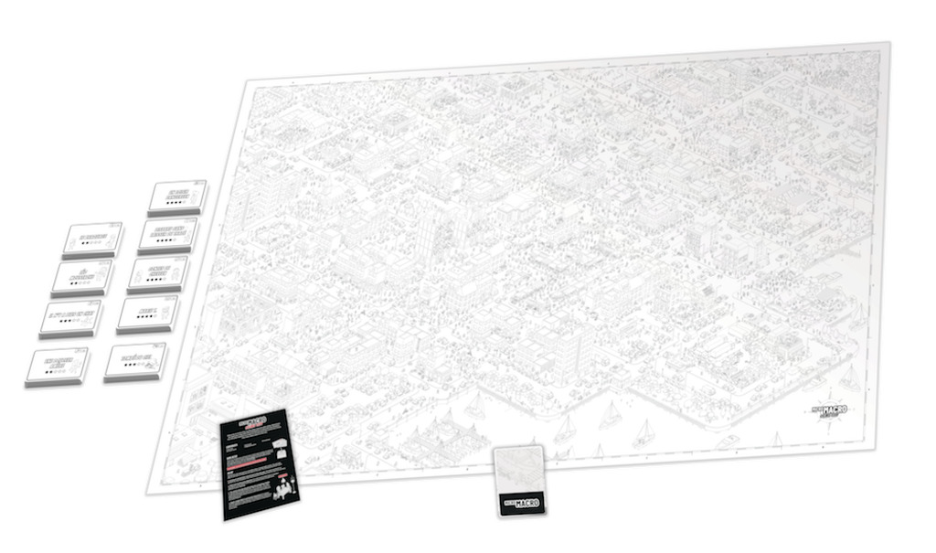 Comment joue-t-on à MicroMacro ? Les joueurs choisissent une enquête, lisent la carte d’introduction, puis répondent aux questions en observant la carte géante. Chaque réponse est vérifiée au dos des cartes questions.