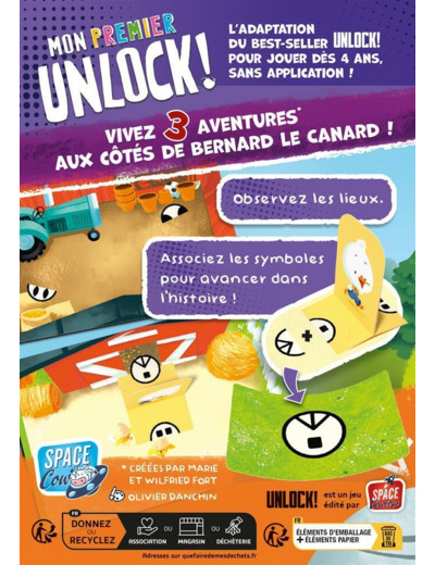 Plongez dans l’univers d’Unlock! dès 4 ans avec Mon Premier Unlock! et aidez Bernard le canard à accomplir ses missions. Observez bien les cartes qui forment un paysage et associez les demi-symboles visibles sur les cartes à l’aide du pion Bernard pour progresser dans l’histoire. Les petits vont adorer pouvoir mener l'enquête.