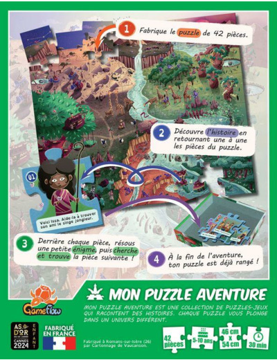 « Mon Puzzle Aventure » est le renouveau d'un classique : le puzzle. Réalise le puzzle puis, une fois les 42 pièces placées, retire-les dans l'ordre et découvre l'histoire en les retournant. Chaque nouvelle pièce donne l'indice pour trouver la suivante.