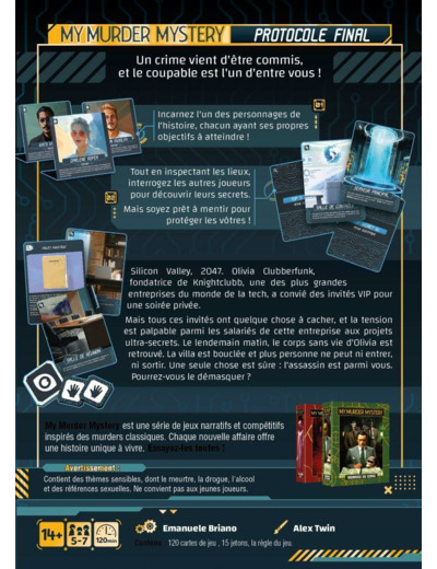 Bienvenue en 2047, dans la Silicon Valley futuriste. Vous êtes conviés à une réception exclusive chez Olivia Clubberfunk, icône de la tech, dont la mort mystérieuse déclenche une course contre la montre. Incarnez un personnage aux objectifs uniques, déchiffrez indices et alibis, et démasquez le coupable parmi les convives. Ce jeu d’enquête compétitif recrée l’intensité d’une Murder Party sans maître de jeu, dans un format compact et immersif.