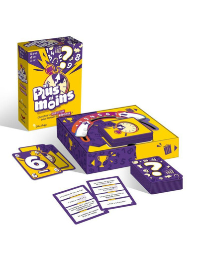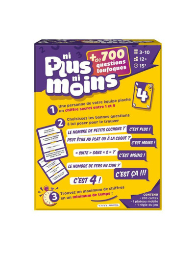 Dans NI PLUS NI MOINS, une personne choisit un numéro secret entre 1 et 9. Les autres posent des questions astucieuses pour deviner ce chiffre en un temps limité, en s’appuyant sur des indices précis et des réponses claires. Chaque partie est un concentré de réflexion rapide et d’interactions dynamiques, parfait pour animer vos soirées ou vos pauses ludiques.