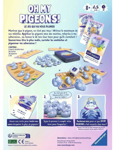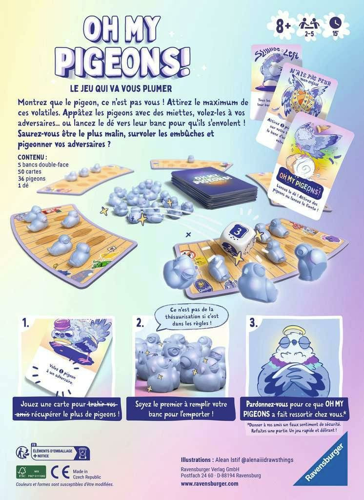 Oh My Pigeons, c'est le jeu qui va transformer votre table en véritable pigeonnier ! Le principe ? Remplir votre banc de pigeons avant les autres. Mais attention, dans ce jeu de société ambiance, rien ne se passe jamais comme prévu.Vous commencez tranquillement à attirer quelques volatiles sur votre banc quand soudain, un adversaire vous vole vos plus beaux spécimens ! Pas le temps de râler : il faut répliquer en balançant des fientes sur ses pigeons pour les faire déguerpir. Entre les cartes qui changent la donne et les coups bas qui pleuvent de partout, chaque partie devient un véritable chaos organisé.Le matériel solide résiste parfaitement aux manipulations répétées - heureusement, car vous allez enchaîner les parties ! Les illustrations pleines d'humour et les références aux pigeons parsemées dans les règles ajoutent cette petite touche de second degré qui fait mouche. Un jeu d'ambiance qui assume complètement son côté déjanté.