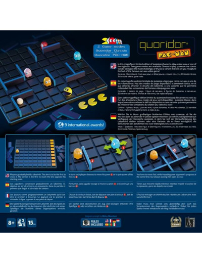 Dans cette magnifique édition limitée du Quoridor, choisissez d'incarner PAC-MAN ou l'un des 4 fantômes. Deux modes de jeux sont disponibles : Quoridor classique, dans lequel vous devez relever le défi du labyrinthe ou une variante qui vous permettra de retrouver les sensations du célèbre jeu vidéo Pacman !