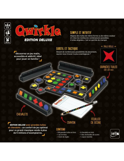 Vous avez une tuile Rond bleu et une tuile Carré violet devant vous. C'est à vous de jouer. Si vous jouez le Rond bleu à gauche du Rond rouge, vous marquerez 2 points (2 tuiles dans la ligne). Si vous jouez le Carré Violet à gauche du Carré rouge ou à droite du Carré bleu, vous marquerez 3 points (3 tuiles dans la ligne). Mais si vous jouez le Rond bleu à droite du Rond rouge (et donc au-dessus du Carré bleu), vous marquerez 4 points (il y a 2 tuiles dans la ligne de ronds et 2 tuiles dans la ligne bleue). Qwirkle se compose de 108 tuiles en bois avec 6 formes de 6 couleurs différentes. Chaque joueur essaye de marquer le maximum de points en constituant des lignes de tuiles ayant une couleur ou une forme en commun.