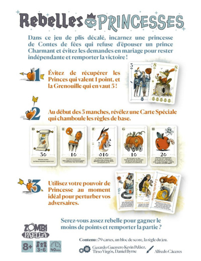 Dans ce jeu de plis décalé, incarnez une princesse de Contes de fées qui refuse d’épouser un prince Charmant ! Évitez les demandes en mariage qui vous feront marquer des points et utilisez votre pouvoir de Princesse pour vous sortir des situations difficiles. La princesse qui a le moins de points à la fin des 5 manches remporte la victoire !