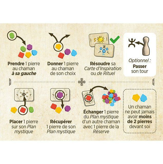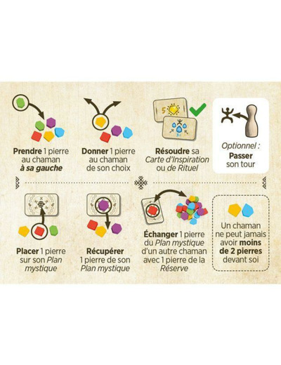 • Chacun votre tour vous jouez 1 action et une seule parmis les 7 possibles du jeu. Le tout en silence et sans donner d’indication gestuelle sur vos intentions. Les autres chamans devront interpréter votre but uniquement grâce à vos actions.