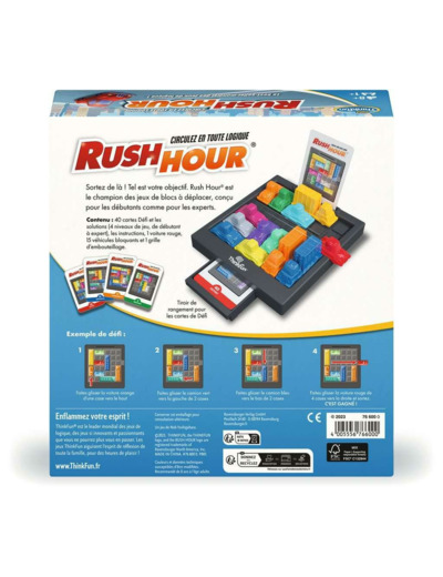 Le coffret comprend 40 cartes défi avec solutions, 1 voiture rouge, 15 véhicules bloquants, 1 grille d’embouteillage et un livret d’instructions. Les défis sont répartis en quatre niveaux : débutant, intermédiaire, avancé et expert.