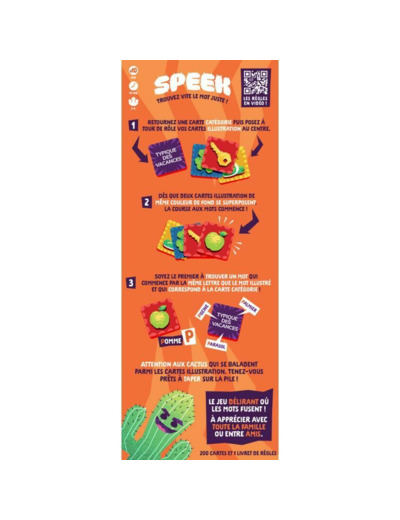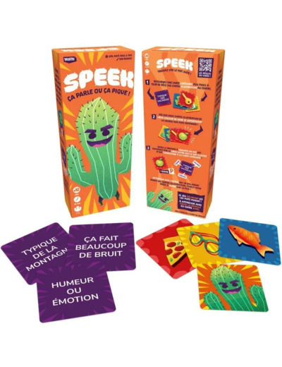 Le coffret contient 200 cartes au format 65 x 65 mm et une règle de jeu claire. Conçu pour 2 à 6 joueurs, SPEEK est édité par TAILEMI SAS et propose des parties rapides de 10 minutes, adaptées à partir de 10 ans.