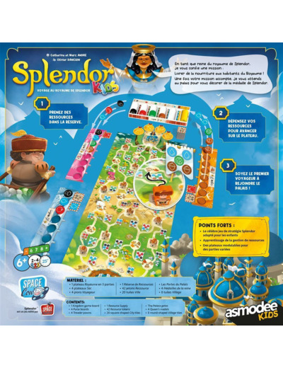 Dans cette adaptation familiale du célèbre jeu Splendor, chaque joueur collecte des ressources (eau, chou, pomme... ) qu’il utilise ensuite pour progresser sur le plateau. Les villes permettent de gagner des ressources permanentes, tandis que les villages offrent l’opportunité de rejouer. Choisissez la meilleure stratégie pour atteindre les Portes du Palais avant leur fermeture : une parfaite initiation au jeu de société pour les enfants.