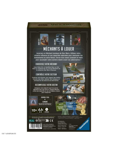 Entrez dans la peau de 3 nouveaux Méchants de l'univers Star Wars : Boba Fett, Cad Bane et la Septième Soeur. Chaque Méchant possède une manière de jouer et de gagner la partie complètement différente. Revivez leur histoire tout en essayant d'en changer la fin ! Suivez votre propre objectif diabolique pour gagner le titre de pire méchant de tous les temps ! Pour y parvenir, utilisez astucieusement vos capacités spéciales et tentez de ruiner les plans de vos adversaires. Car ce n’est qu’en dictant avec succès vos règles aux héros de Star Wars que vous pourrez espérer une fin... malheureuse ! Réveillez le Mal qui est en vous... Suivez vos propres plans machiavéliques, soyez opportunistes et stratège pour devenir le plus grand méchant de Star Wars ! Avec ces 3 nouveaux méchants vous aurez encore plus de possibilités de faire le mal !Jouable seul ou combinable avec n'importe quel autre jeu de la collection Star Wars Villainous. Jeu jouable dès 10 ans pour 2 à 3 joueurs pour de parties de 20 minutes par joueur.