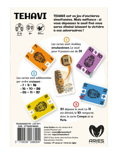 Fort d’une mécanique simple et intuitive, Tehavi offre de nombreux rebondissements et du suspens à chaque tour : le jeu parfait pour des parties uniques et amusantes d'environ 20 minutes.
