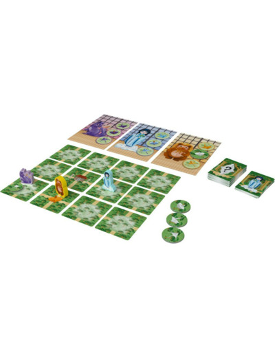 À votre tour, piochez une carte pour déplacer un des pions Yokai sur le plateau modulable (composé de 12 tuiles Forêt face cachée). En suivant les chemins, vous pouvez explorer une tuile encore cachée : si elle contient un jouet de la couleur du pion Yokai, révélez la tuile et gagnez le jeton correspondant !