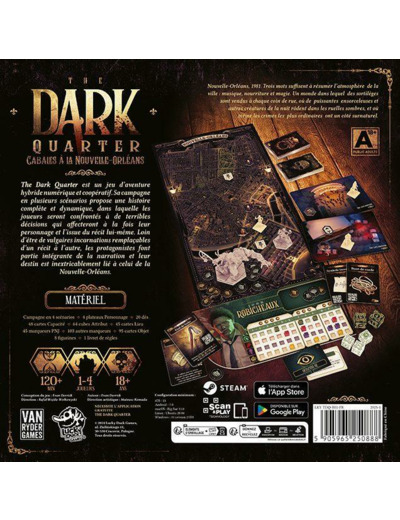 The Dark Quarter est un jeu d’aventure hybride numérique et coopératif. Sa campagne en plusieurs scénarios propose une histoire complète et dynamique, dans laquelle les joueurs seront confrontés à de terribles décisions qui affecteront à la fois leur personnage et l’issue du récit lui-même.