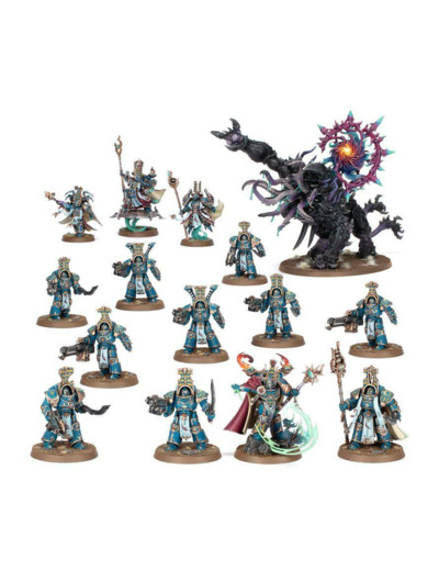 Cette boîte pleine à craquer est parfaite pour entamer une nouvelle collection des Thousand Sons ou pour étoffer une armée existante que vous pourrez ensuite déchaîner dans les parties de Warhammer 40,000, en faisant des économies par rapport à un achat des kits au détail. Cette force est menée par un Maître Infernal, un puissant sorcier capable d'invoquer des démons et de confondre l'esprit de ses ennemis à l'aide de ses sorts, ainsi que par un trio de Sorciers Exaltés qui feront en sorte qu'aucun endroit du champ de bataille ne soit à l'abri de votre domination psychique. Deux unités de Terminators du Scarabée Occulte – des fantassins d'élite maniant de redoutables armes ensorcelées – constituent l'ossature de la force. Ils sont soutenus par une Mutalithe à Vortex, une créature ayant horriblement muté sous l'influence de Tzeentch, et capable de dissoudre la raison de ses adversaires avant de les déchiqueter de ses immenses griffes.