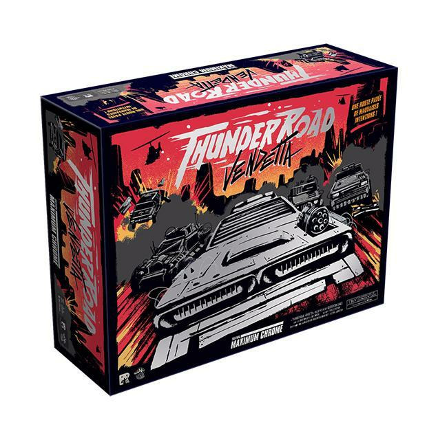 Thunder Road : Vendetta est la restauration survoltée du jeu classique de 1986 qui met la pagaille sur l’asphalte. Rassemblez votre équipe, lancez vos dés, faites la course avec vos voitures, tirez avec vos armes et essayez de ne pas vous faire démolir !