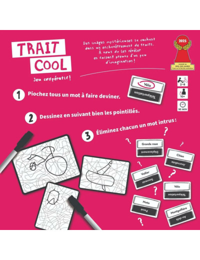 TRAIT COOL invite chaque joueur à deviner un mot en dessinant uniquement sur un réseau de traits préexistants. En piochant secrètement un mot, vous relevez le défi graphique de le représenter sans dépasser les lignes pointillées. Une fois les croquis terminés, les cartes-mots sont mélangées avec des leurres et présentées à tous. Ensemble, éliminez les mots qui ne correspondent à aucun dessin et rapprochez-vous de la victoire. Ce jeu coopératif stimule l’intuition, la créativité et la communication, idéal pour animer vos soirées en famille ou entre amis.