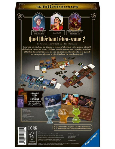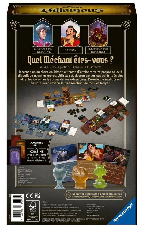 Cette extension vous propose trois nouveaux personnages emblématiques : Gaston de La Belle et la Bête, Madame de Trémaine de Cendrillon, et Le Seigneur des Ténèbres de Taram et le Chaudron magique. Chacun apporte ses propres objectifs et tactiques, renouvelant l’expérience de jeu avec des défis uniques. Que vous jouiez seul ou jusqu’à six en combinant avec le jeu de base, préparez-vous à des parties intenses où la ruse et la stratégie sont les clés de la victoire.