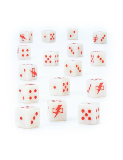 Ce set de 16 dés à six faces aux arêtes carrées, sur le thème des White Scars, s'utilise lors des parties de Warhammer 40,000. Ils sont en plastique acrylique blanc nacré avec des marquages rouges et mesurent 16mm de côté. Les faces 1 à 5 ont des marquages traditionnels, et la face du 6 est décorée d'une icône d'éclair des White Scars.