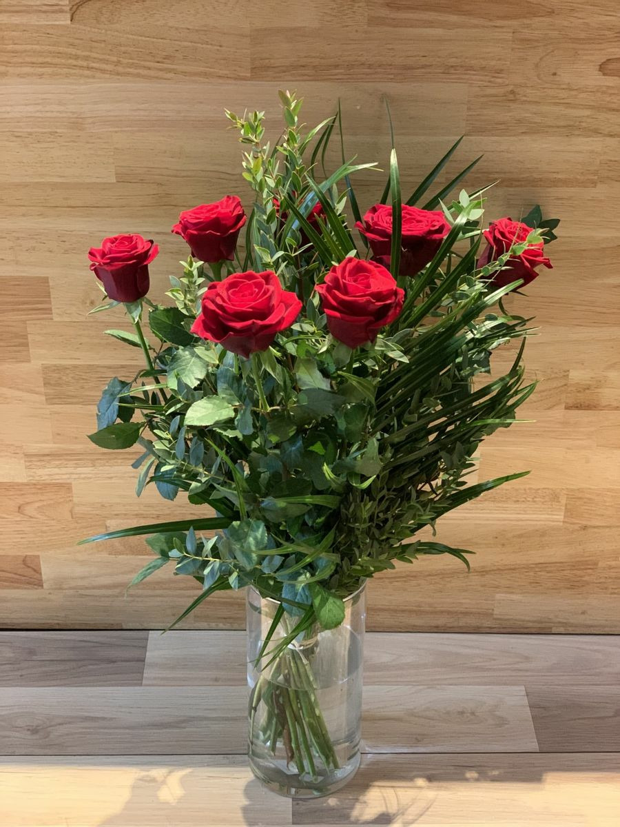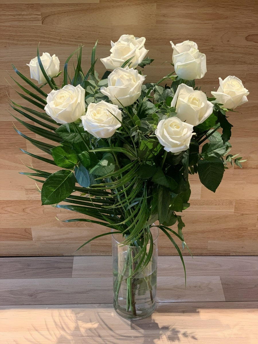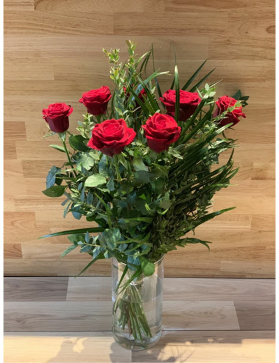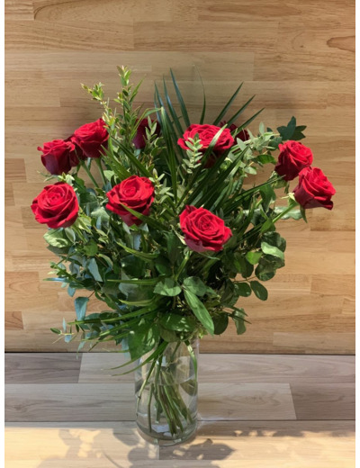 Bouquet composé de 11 Roses roses, gros boutons et longues tiges, ainsi que du feuillage.