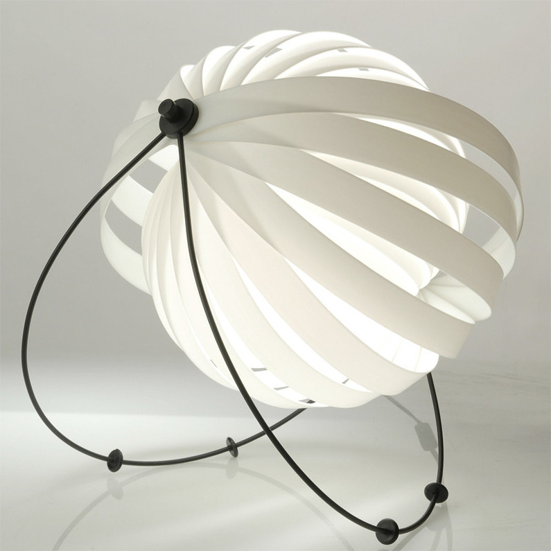 Une lampe intrigante et fascinante. Fabriquée à partir d'une unique bande de plastique enroulée sur elle même, la structure peut être manipulée afin d'en changer la forme et l'orientation de l'éclairage. Les pieds en métal sont équipés de petites pastilles permettant de maintenir la lampe dans différentes positions, et peuvent également être enlevés afin d'obtenir une suspension. La lampe est livrée dans un emballage plat sérigraphié, rappelant une "boîte à pizza".