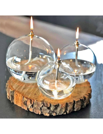 Lampe à huile ronde transparente avec porte mèche en acier chromé.