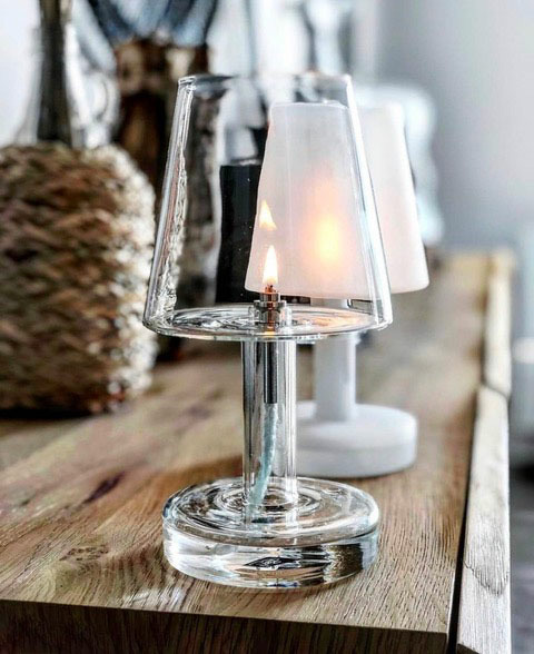Une lampe à huile originale sous forme d’une lampe de salon, la flamme est à l’abri du vent.