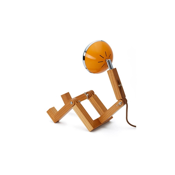 La tête est un phare de voiture vintage ; elle est réglable (120°) tout comme l’ensemble du corps de la lampe. Vous pouvez la placer en position relax et décontractée avec les deux jambes sur la table ou pendantes.